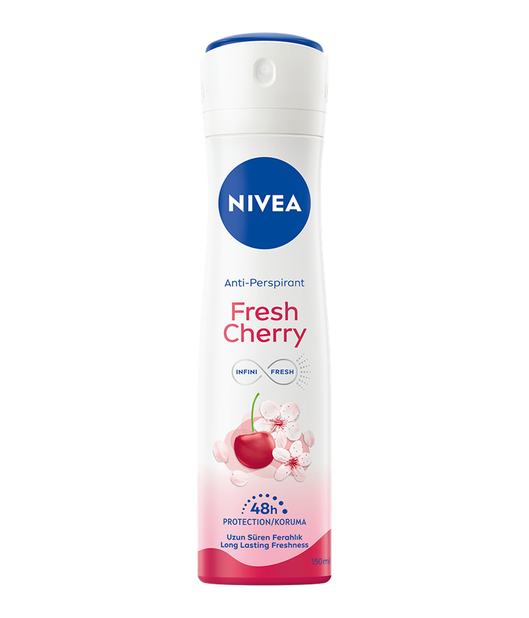 NIVEA Fresh Cherry, sizi kiraz çiçeklerinden gelen esansı ile canlandırır. 48 saat boyunca terlemeye ve ter kokusuna karşı cildinize önem veren anti-perspirant koruma sağlar.